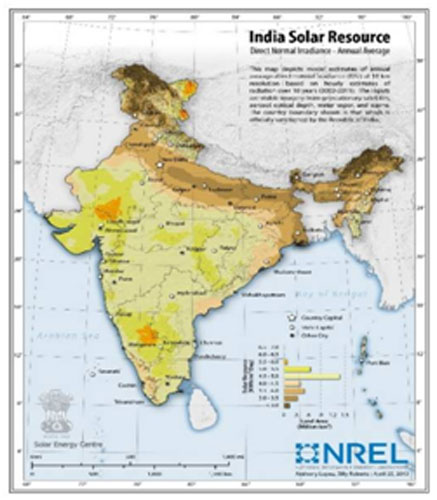 India, with its large population and rapidly growing economy, needs access to clean, cheap and reliable sources of energy. India lies in the high solar insolation region, endowed with huge solar energy potential with most of the country having about 300 days of sunshine per year with annual mean daily global solar radiation in the range of 4 – 7 kWh/m2/day. Solar power can also help meet energy requirements for both grid connected as well as off-grid applications such as solar powered agricultural pump sets.